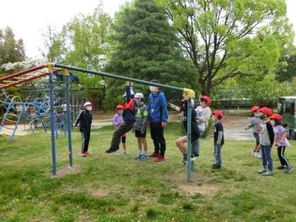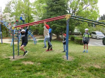 雲梯(うんてい)では、1年生と6年生が一緒に遊んでいました。