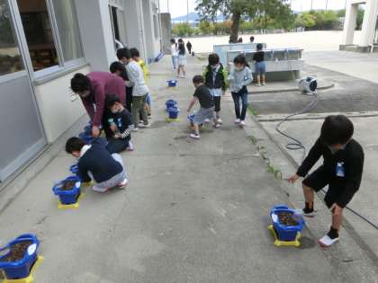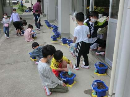 アサガオの種を植木鉢に蒔きました。種をまいた後、ペットボトルを使って、しっかり水をあげました。