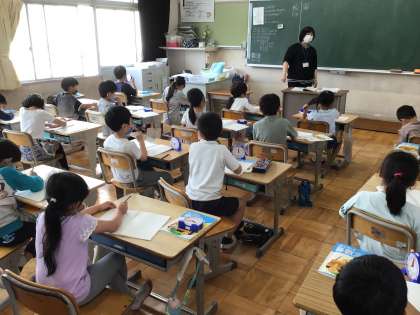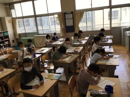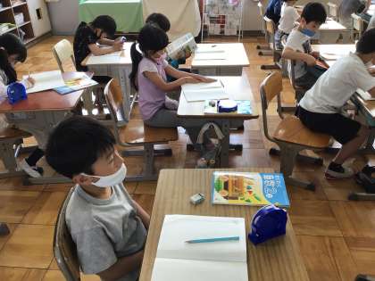 時こくと時間の授業です。自分の時計を動かしながら正しい時間に合わせています。時間の読み方もバッチリですね。