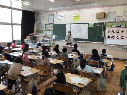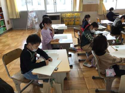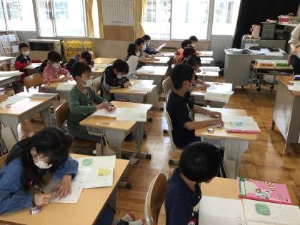 国語「風のゆうびんやさん」の授業です。みんなでくもの声を思いうかべながら音読しています。どんな声だろうねー?