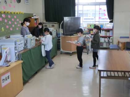 本を借りる手続きをしているところです。はきはきと「ありがとうございます」とお礼を言える子が多く、とても立派でした。改めて、礼儀は大切なものだと感じました。