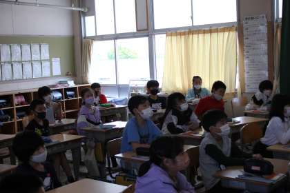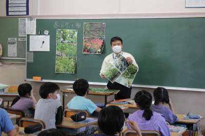 寿恵野小学校の敷地にある植物の写真を見て、それが何か考えていました。後で、いきいきランドなど植物や昆虫の観察を行いました。