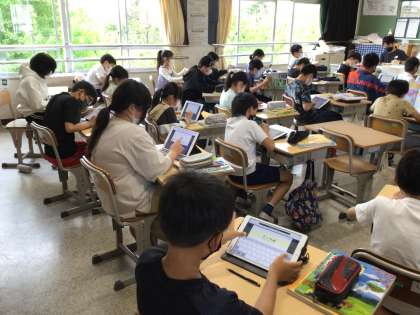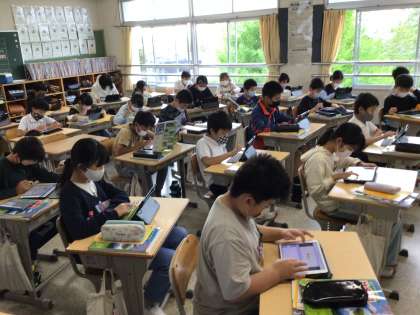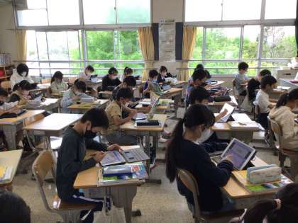 社会「世界の中の国土」の授業です。大陸の位置や名前を一生懸命覚えています。5年生の集中力はすごいですね。