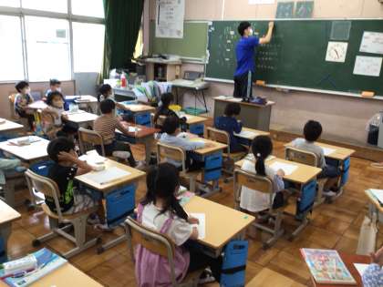 算数「いくつといくつ」の授業です。数字ブロックを使って、7という数字がどのような数の組み合わせでできるか確認をしていますね。
