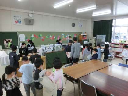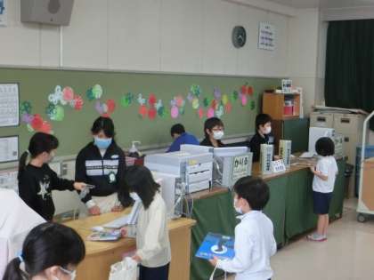 朝の図書室の様子です。何人かの子が本を借りに来ていました。カウンターの中にいるのは、5,6年生の図書委員で木曜日朝の担当の子たちです。