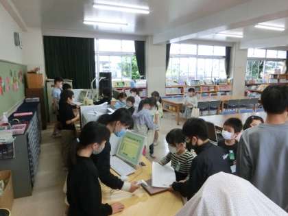 やがて、1年4組の皆さんが、本を借りに来ました。皆さん、楽しそうに本を選んでいました。そして、こうした場面でも、6年生の皆さんがよくサポートしてくれています。