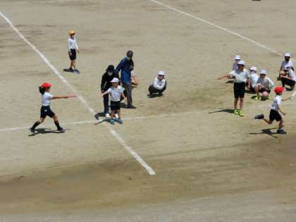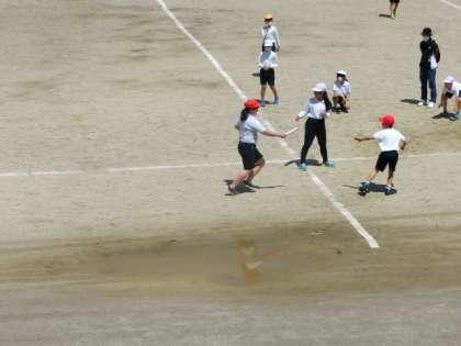 運動場でリレーの学習をしていました。さすが高学年。手を伸ばしてバトンを受け取ったり、リードを取ったり、タイムを少しでも縮めるための工夫ができています。