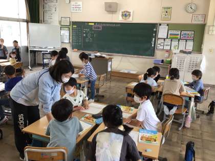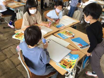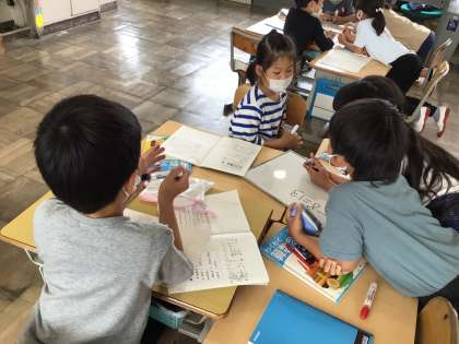 算数「足し算と引き算」の授業です。グループになって、さくらんぼ計算の説明をしています。友達に伝えるために、ホワイトボードに考えを書いていますね。