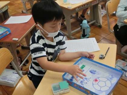 1の2でも、おはじきを使ったゲームをしていました。こうしたゲームを通すことで、「1」と「9」のように「10」になる組み合わせとなる数を、子どもたちが実感をもって理解していけるようにしています。
