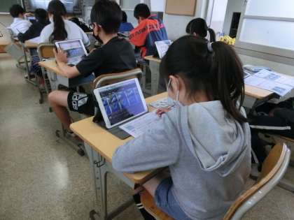 タブレットを使って、雲の変化と天気の変化の関連を考えていました。