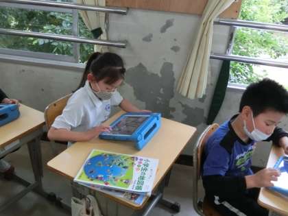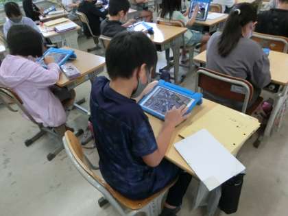 タブレットを使っています。地図アプリの航空写真やストリートビューの機能を使って、自分の家や自分の家から学校までの経路を確かめていました。