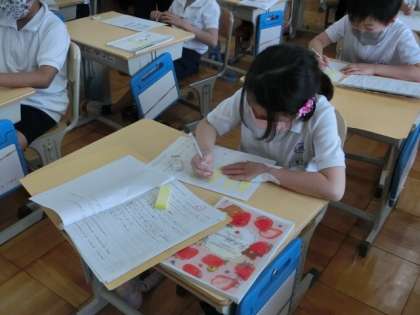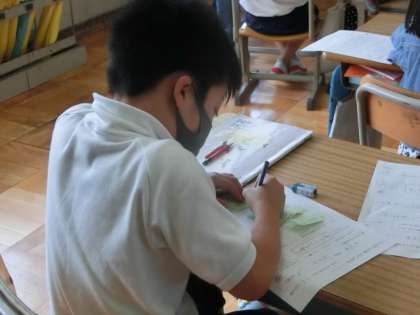 一人一人が家でやっているお手伝いについて伝える文章を作ります。この時間では、自分で付箋に書いたメモをもとに、その手順ややり方をどう説明するか考えていきます。