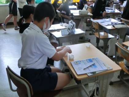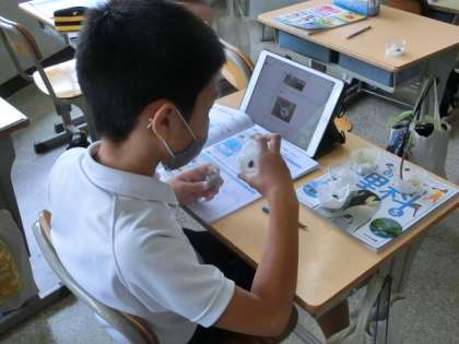 植物の発芽の条件について、実際に発芽したインゲンやこれまでの実験結果の写真をもとに整理しました。これまでの実験結果は、タブレットを使って、学級全員で共有しています。