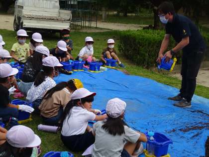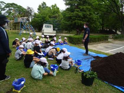 2年生は、大橋園芸さんに教えていただきながら、野菜の苗植えをしました。植木鉢に土を入れるやり方からおしえていただきました。