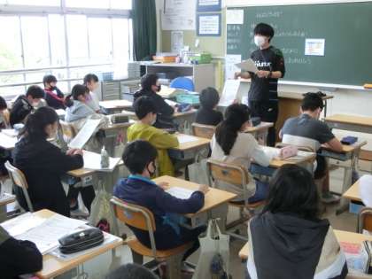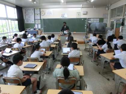 上の写真は、朝に配付されたプリントの説明を聞いているところです(6の3)。下の写真は、タブレットで担任の先生が送った連絡事項を確認しているところです(5の3)。さすが高学年。プリントやタブレットを見ながら、先生の説明を上手に聞いています。
