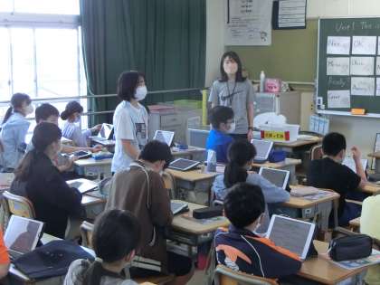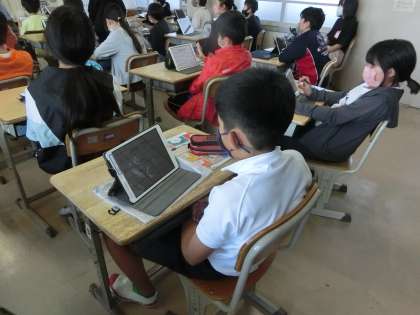 タブレットを活用しながら、学習を進めていました。これらの写真は、「What language do you study?」と聞かれて、どう答えるのかを考えているところです。