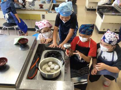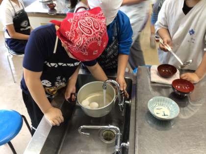 「ゆで卵」の作り方の授業です。水の状態から卵を入れるのがポイントですね。調理実習はドキドキ、ワクワクですね。