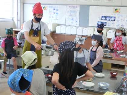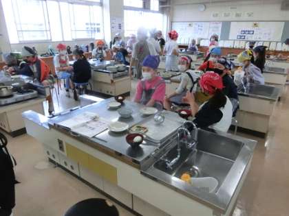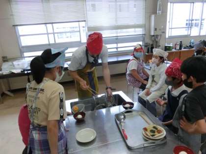 ゆで卵は鍋でゆでた後、各自のお椀に取り出しました。熱を通した後は、物品や食べ物を食べる本人しか手では直接触らないようにするなど、感染対策を行っています。青菜のお浸しは、教師が調理し、その様子を子どもたちに見せるだけにしました。