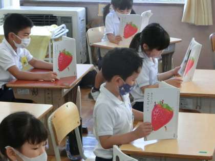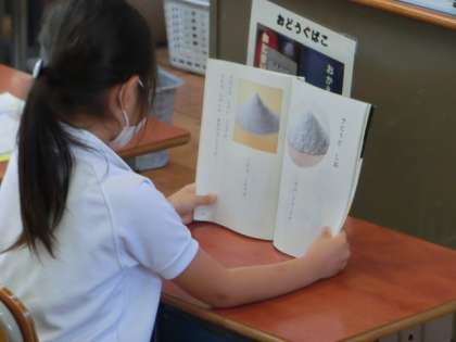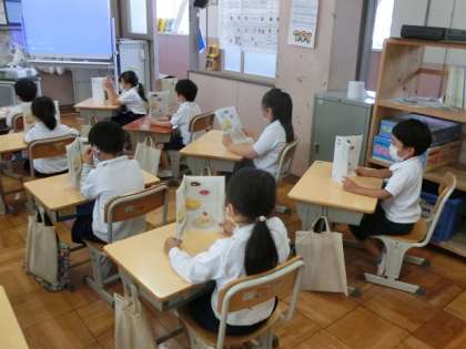 先生の後について、教科書の文章(説明文)を読みました。みんな、教科書をしっかり持って、とても良い姿勢になっています。