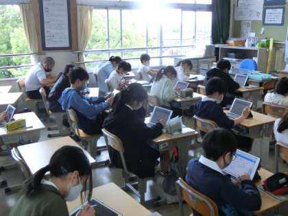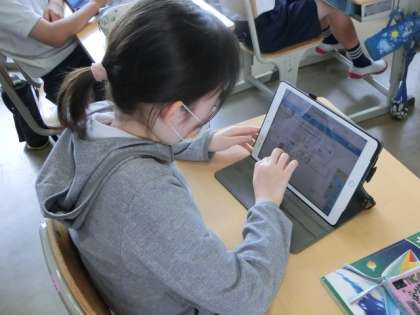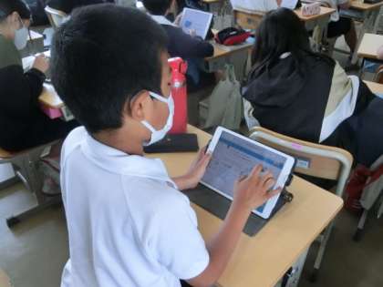 分数×分数の計算の仕方について、学習用タブレットを使いながら考えていました。図に補助線を入れるなどして、一人一人工夫しています。算数では、計算ができるようになることも大切ですが、このように自分の力で解き方を考えていけることもとても大切です。