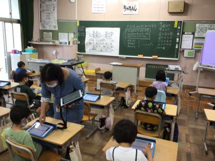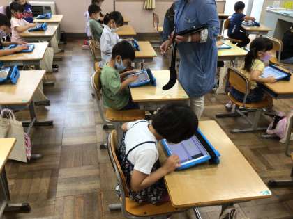 タブレットを活用して、足し算の問題を作っています。あっという間に問題を作り、先生に提出していましたね。