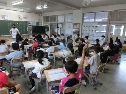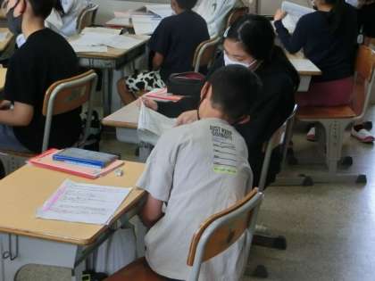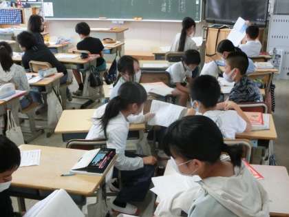 説明文の要旨をまとめる学習をしていました。難しいところがあるようで、ペアでの相談がとても活発に行われていました。