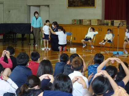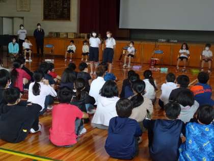 6・7・8・9組の子どもたちが、自分たちのことをクイズで紹介したり、特別支援学級での学習活動の様子を伝えたりしています。今日は、交流学級である5の3と6の2のみんなに発表しました。