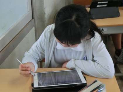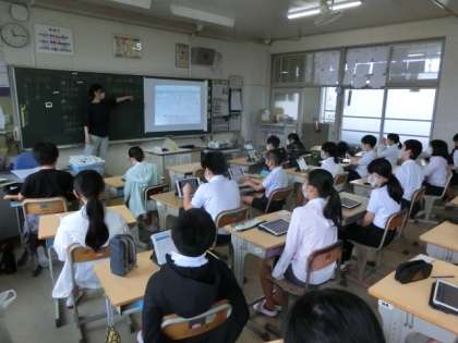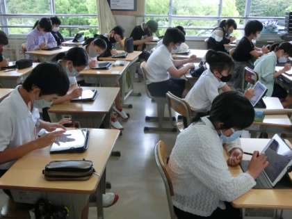 かけ算で、かける数が1より大きい時、積はかけられる数より大きくなる。かける数が小さい時はその逆になる。整数や小数だと成り立つこの関係が分数でも成り立つかを考えました。タブレットで自分の考えを整理しています。