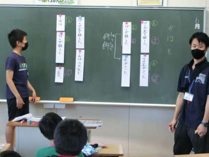 「ぼくが花を植えた。その花が咲いた。」「ぼくが植えた花が咲いた」同じ意味合いですが、後者は「ぼくが植えた」の部分が「花」を修飾する関係となります。こうしたことを、みんなで確かめ、学びました。