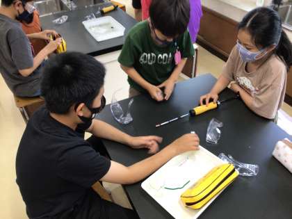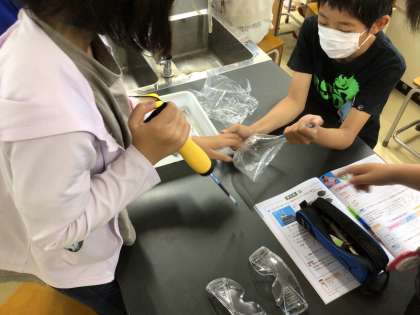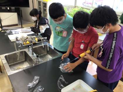 理科「体のつくりとはたらき」の授業です。吸う空気と吐く空気の違いについて、気体検知管を使って調べています。どのような違いがあったのかな?