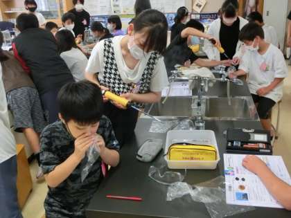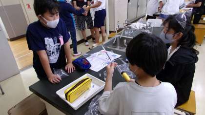 吸う空気と吐く空気に含まれる酸素と二酸化炭素の割合を調べています。酸素の気体検知管は、使用すると熱くなります。石灰水は薬品の一つです。一歩間違えれば危険を伴いっます。まさに、最高学年の6年生だからこそ、安全に実験できると言えると思います。