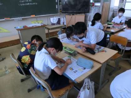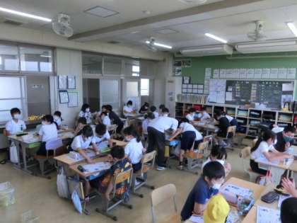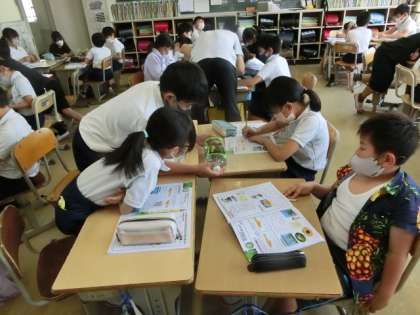 ペットボトル水槽に入っているメダカのオスとメスを見分けていました。背びれ・尻びれで見分けることができます。慣れるまでは、結構難しいです。一生懸命、上から横からじっくり観察していました。
