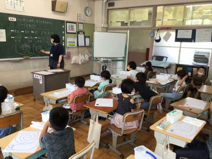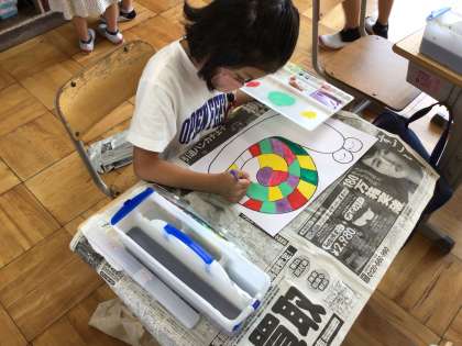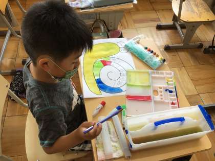 かたつむりの殻の模様や配色を工夫して、自分だけのオリジナルかたつむりを描いています。とっても素敵なにじいろかたつむりですね。
