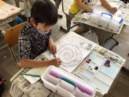 かたつむりの表情や殻の模様を工夫して、自分だけのかたつむりを描いています。色塗りが楽しみですね。どのようなかたつむりになるのでしょうか。