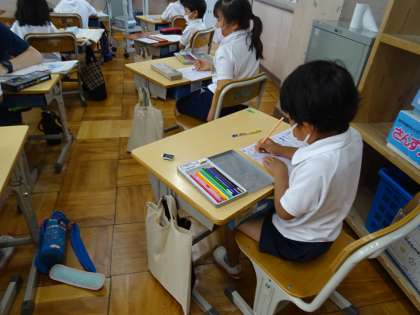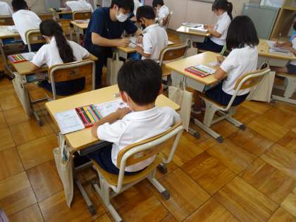 ひらがなの練習をしています。今日は「れ」でした。「れ」の付く言葉も書きました。