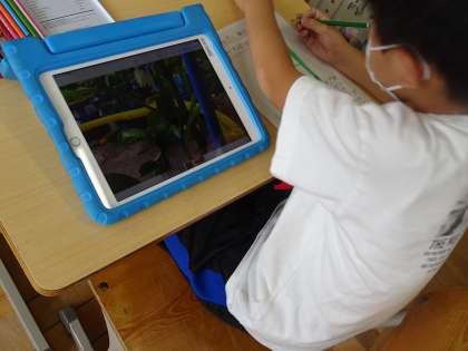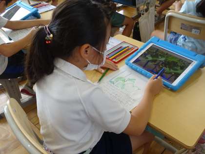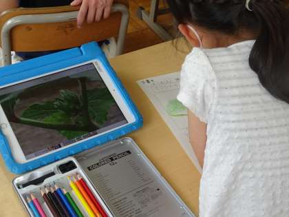 野菜の観察記録を書いています。葉やつぼみの色や形もよく見て書きました。