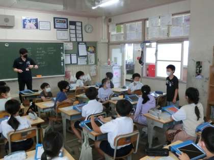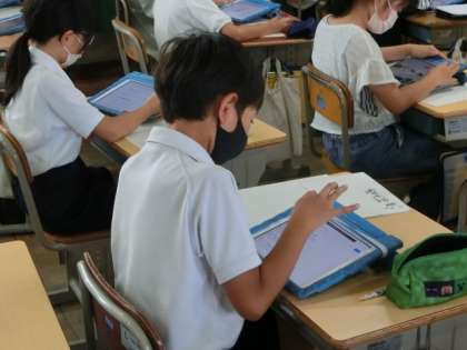 ビオトープには在来種のみを残したい。外来種も残したい。半々にしたい。いろいろな考えが出されたため、どうするとよいか、タブレットで調べてみることになりました。総合的な学習の時間は、このように、子どもたちの課題意識に応じて、柔軟に学習を進めていきます。