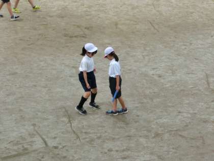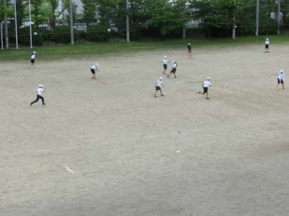 バトンパスの練習です。前の走者がどの位置まで来たら、次の走者がスタートするのか。そのベストな位置を探しています。