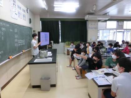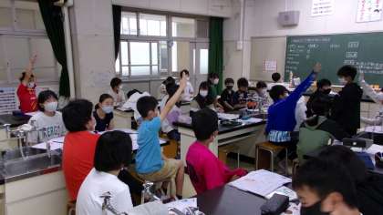 ごはん(お米)が口の中に入り、唾液と混じるとどうなるのかについて、自分の予想を発表しているところです。