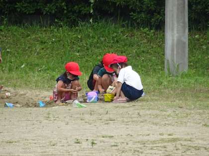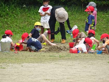 砂場でお城や川など思い思いの形を作っていました。熱中なしながら活動していました。