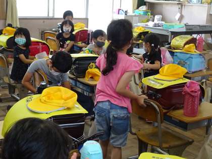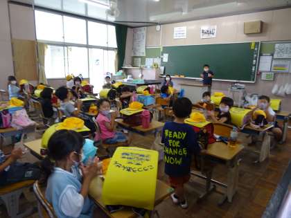 帰りの会で今日を振り返っています。頑張ったことを発表する子に、みんなが拍手を送っていました。