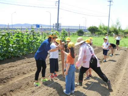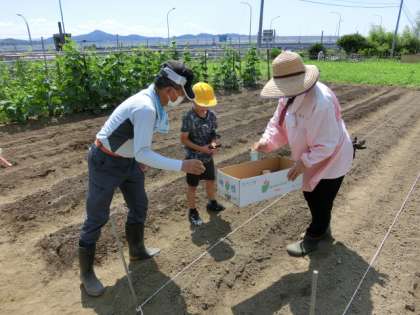 穴をあけ、種をまき、土をかぶせて、水をかけます。みんなで手分けして行いました。