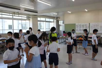 ごみに関係するクイズをカードをもって友達と出し合いました。一生懸命考えて答える姿が見られました。