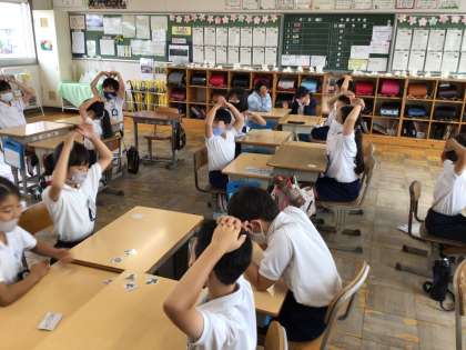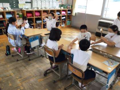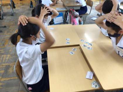 アクティビティのEnglishかるたです。新しい単語を耳で聞きながら覚えています。みんな楽しそうですね。
