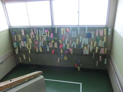 階段の踊り場に、七夕飾りが飾ってありました。さすが、6年生。内容がなかなか「大人」です。