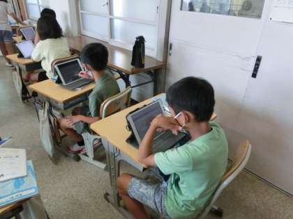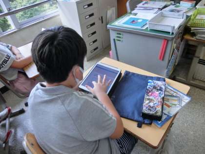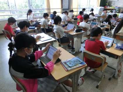 三角形の内角の和が180度であることを利用して、多角形の内角の和が何度になるかを考えています。みんな、タブレットを思い思いに使って、考えを巡らせていました。