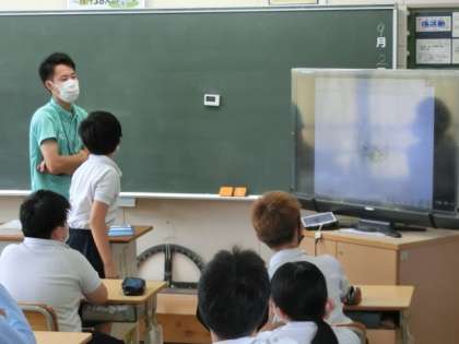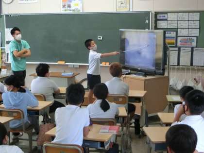 アップの画像では、雲の画像と気づいていなかった子もいましたが、少し引いた画像を見て台風の雲の画像だと気づいていました。早く気づけた子が、他の子に説明をしていました。