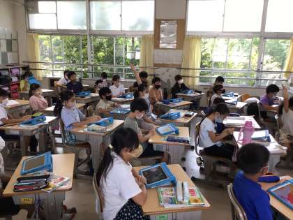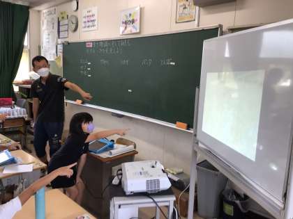 学校のビオトープには、どのような生き物がいるのか、タブレットを使って撮影しました。それを、学級で発表していますね。