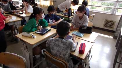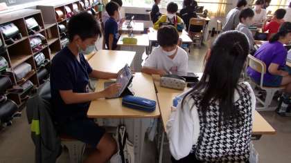 この問題を解くのに、どんな計算をすればよいかを考えています。まず、タブレットを使って自分で考え、その後、グループで学び合いました。