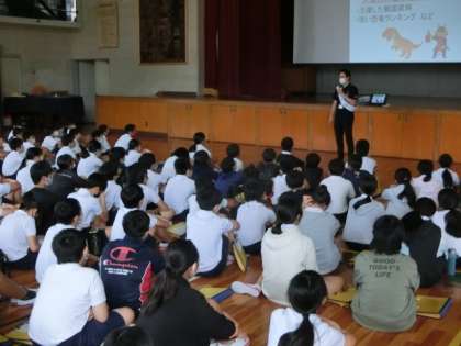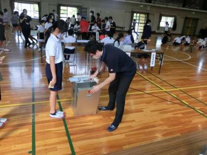 豊田市選挙管理委員会の方を講師に、開かれました。活動の中心は模擬選挙。まずは、立候補者(役)の話を聞き、その後、投票に移ります。